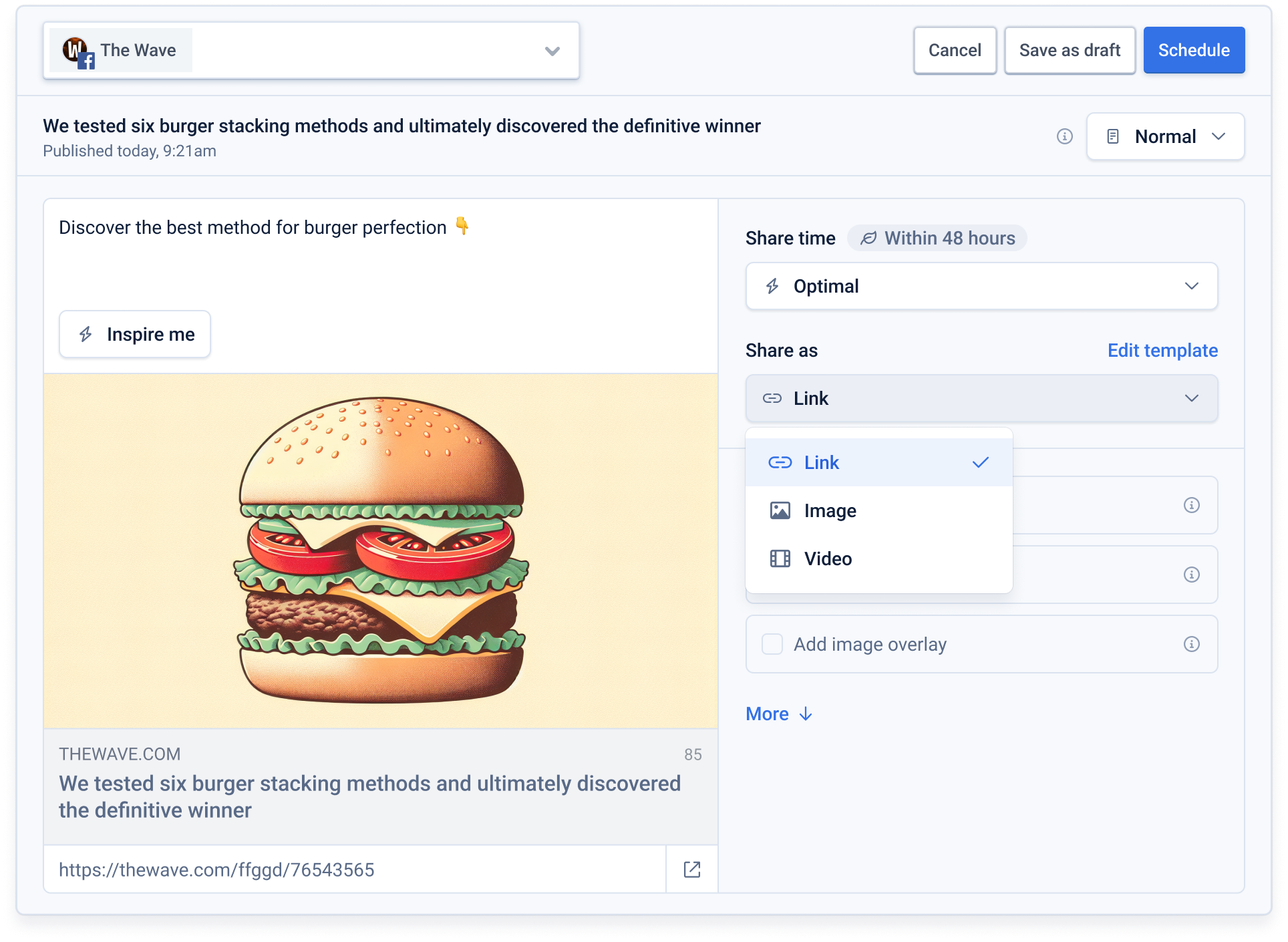 Just as for images, you can use the 'Share as' dropdown to change the media type from article to video.