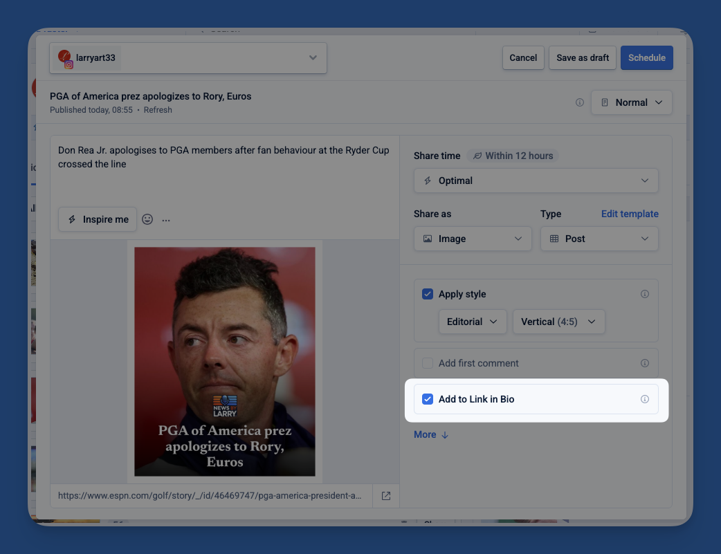 It's easy! Whenever you're sharing to Instagram from Echobox, make sure the "post to link in bio" option is checked and the thumbnail will appear in your Link in Bio just as in your Instagram grid. (It'll be checked by default).
