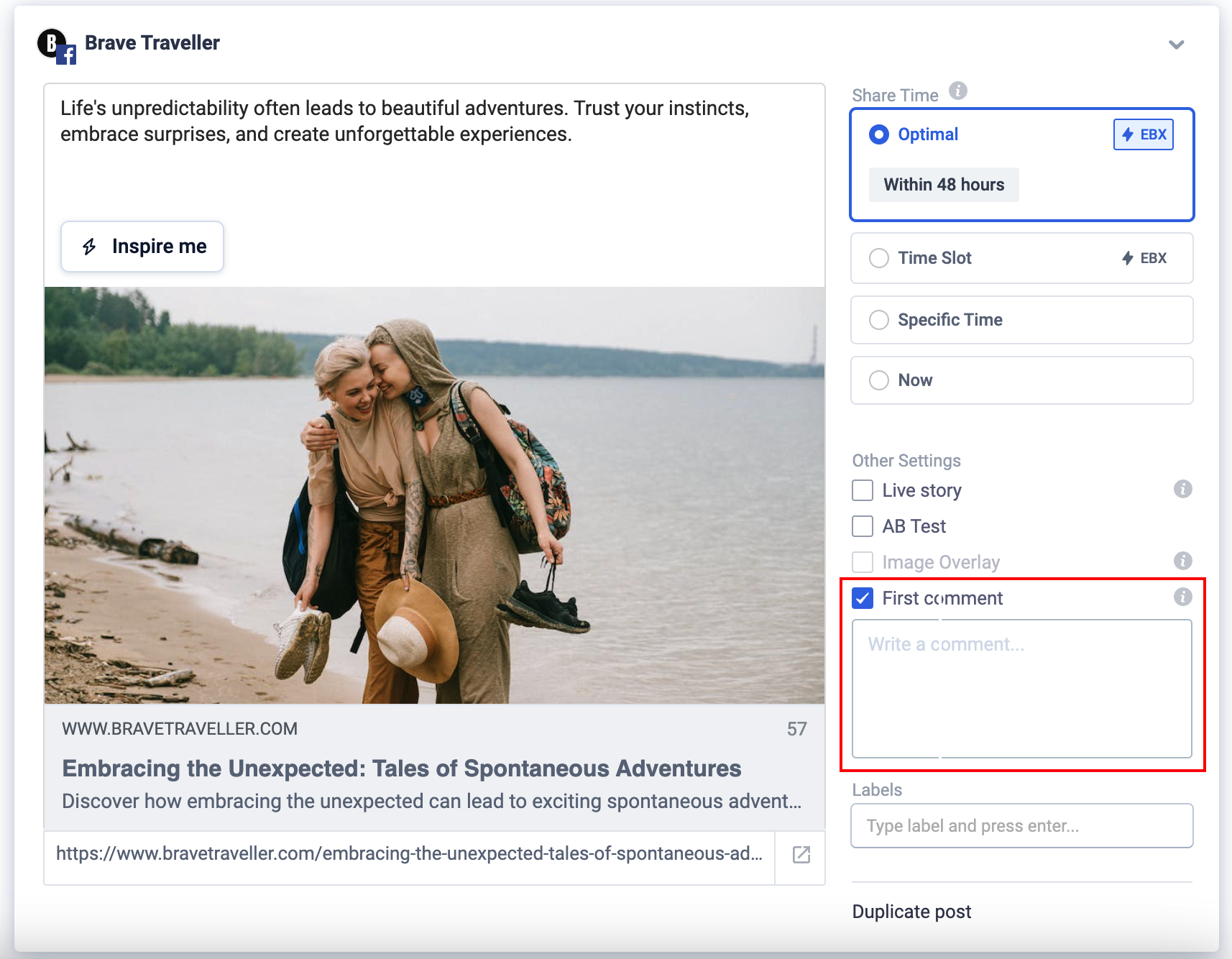 Echobox's First Comment feature allows you to pre-write a comment that will be posted at the same time as your share. This is particularly useful when taking advantage of Echobox’s share time optimization.