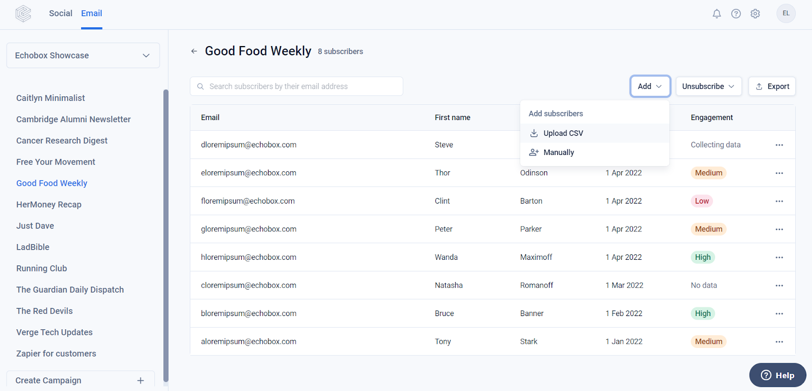 If you are just starting out with Echobox Email or have a list of subscribers to bulk add from an external platform, there are some options for adding subscribers manually.