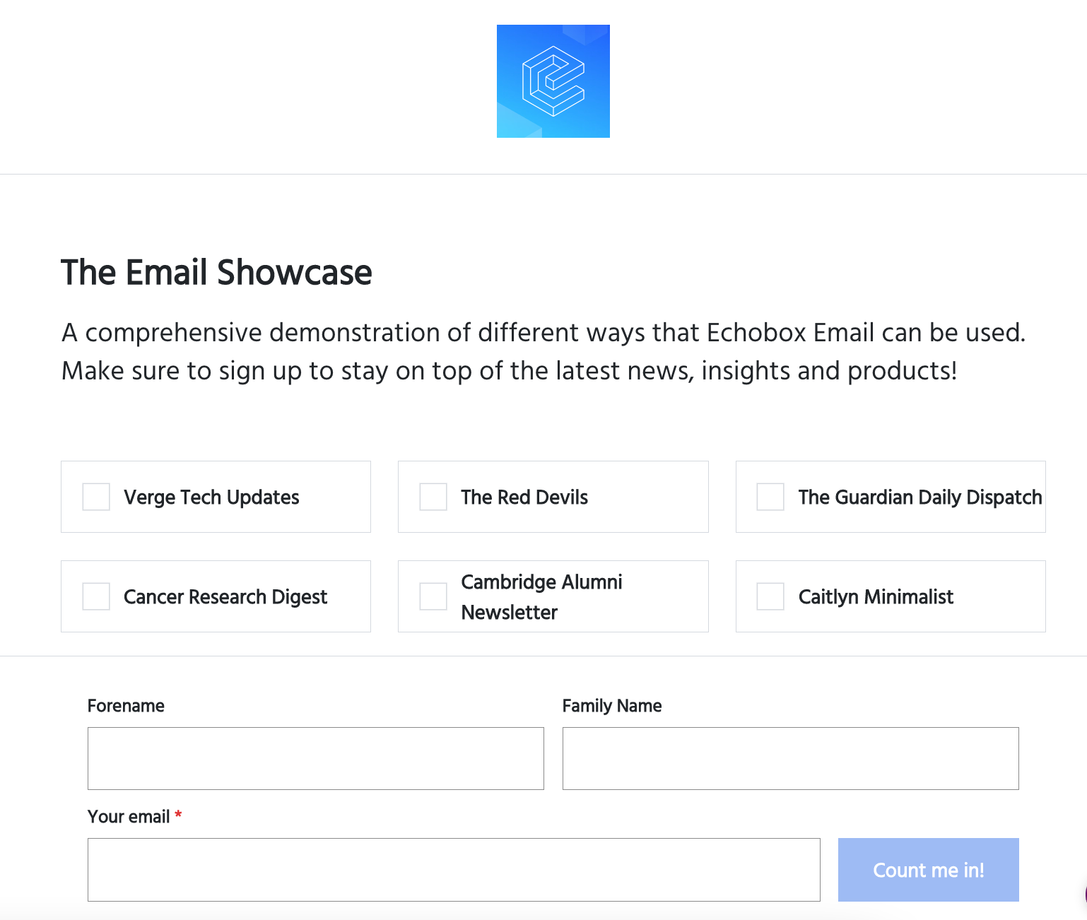 Echobox forms can also be embedded directly into your website, so new subscribers don't even have to leave your website to subscribe. These use the same branding and copy as the hosted versions of the subscription page.