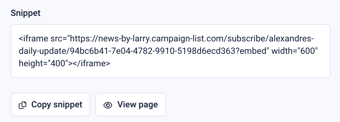 To find a snippet for your Campaign, navigate to Campaigns > [Campaign Name] > Signup forms > Embedded form.
