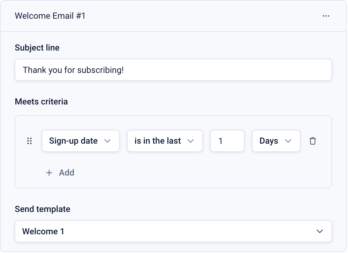 The ‘Meets criteria’ section allows you to specify the criteria that will qualify subscribers for entry into the journey. In this example, subscribers who have signed up within the last day will qualify.