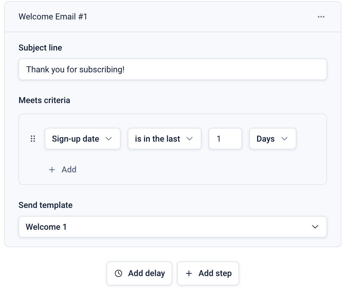 As this is a welcome series and we have already specified the criteria that start subscribers on the journey, the ‘Meets criteria’ section in the second step is left blank.