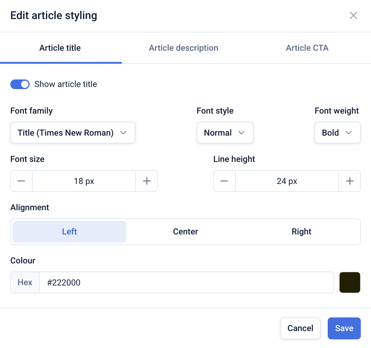 On the ‘Article title’ tab you can toggle the display of the article title on or off. You can also configure the title font style, size, alignment and colour.