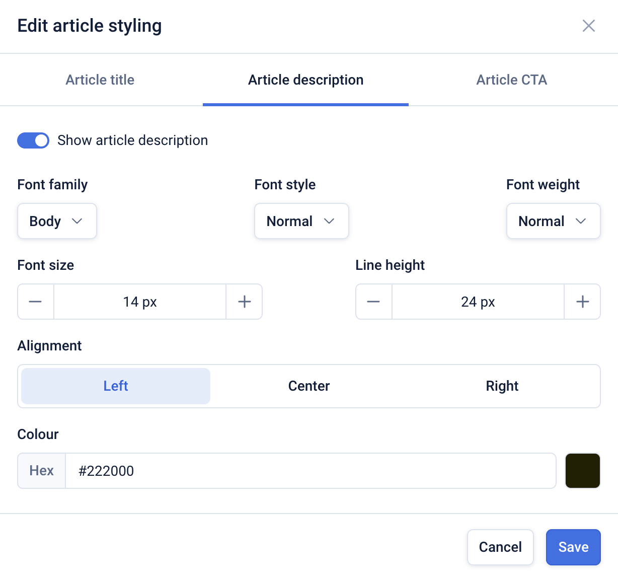 On the ‘Article description’ tab you can toggle the display of the article description on or off. You can also configure the description font style, size, alignment and colour.
