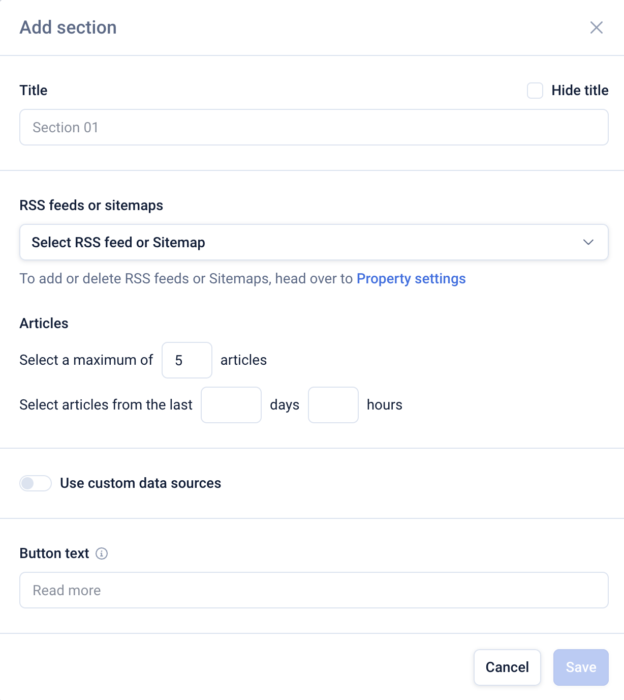 Add a section title, select one or more RSS feeds or sitemaps and specify the number of articles and the time period.