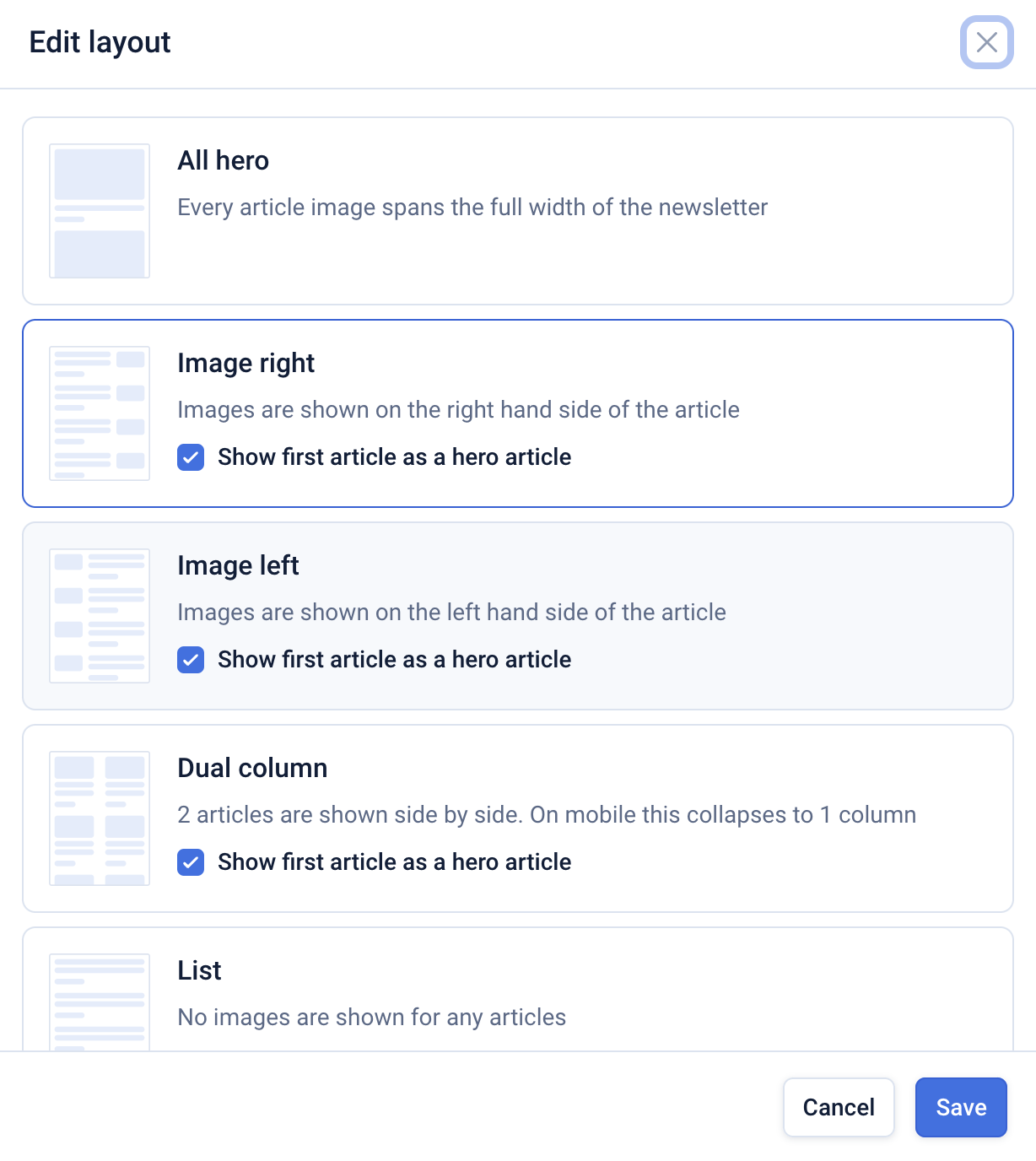 Choose a layout from the available options. You can toggle off the ‘Show first article as a hero article’ if you do not wish to display a hero layout for the first article in the section.