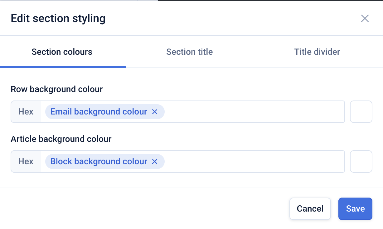 Section styling refers to the section colours, title and title divider. To style the article section, open the 3-dot menu and click ‘Section styling’.