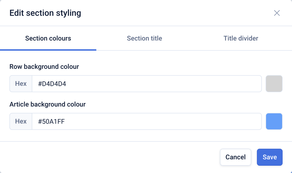 You can apply colours to the row background and the article background by clicking on the colour swatch on the right-hand side, selecting a desired colour and clicking ‘Save’.