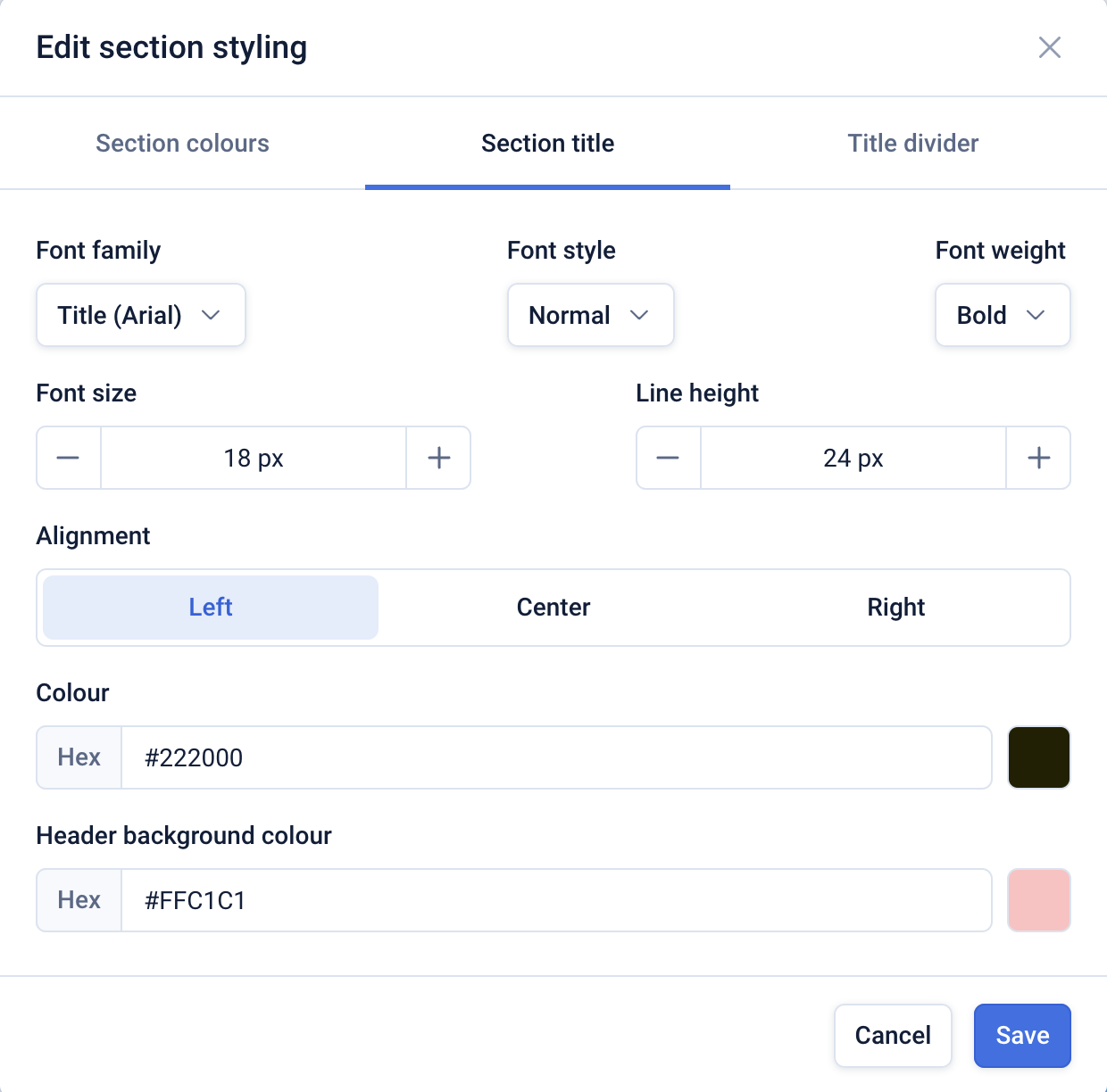 The ‘Section title’ tab refers to the title of the article section. Here you can modify the font styles, alignment and the colour of the text and the background colour of the header (see the pink background in the example above).