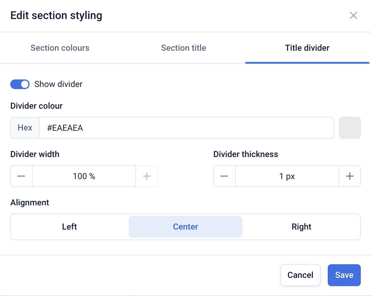 A title divider is a dividing line between the section title and the articles. On this tab you can toggle on or off the divider display and configure the colour, weight, thickness and alignment.