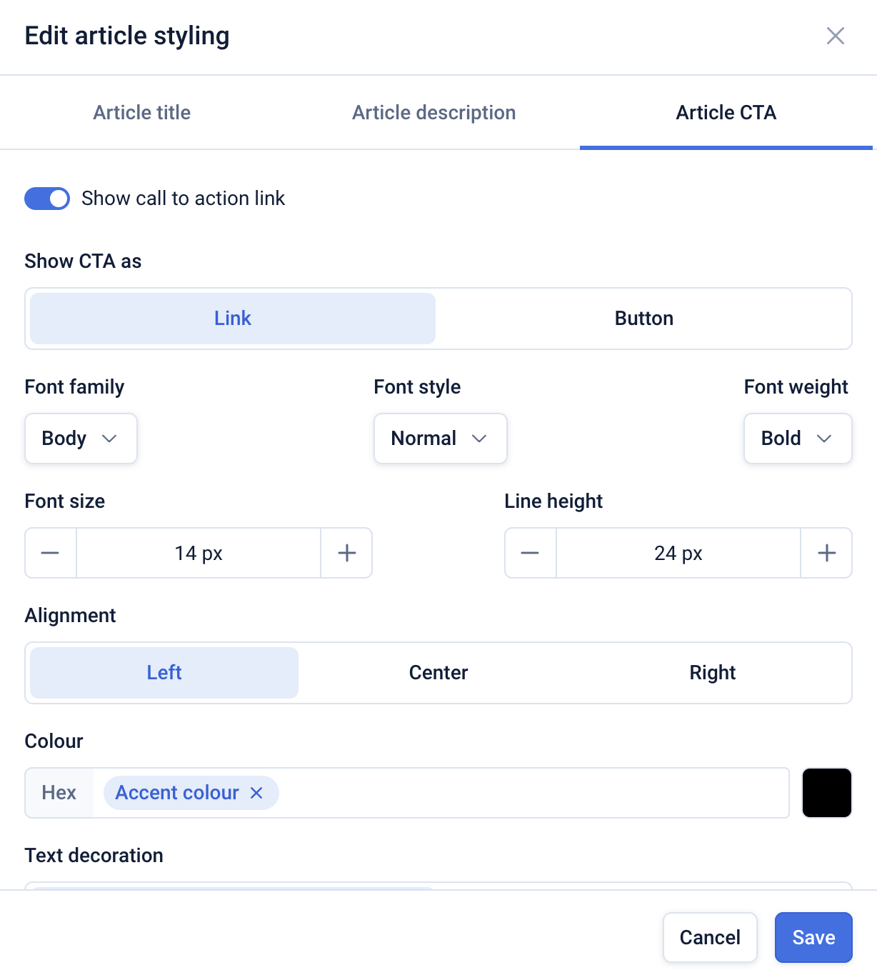 Article styling refers to settings that alter the display of the article title, description and CTA. The article CTA refers to the button or CTA text e.g. ‘Read more’, that you can configure on the ‘Content’ menu.