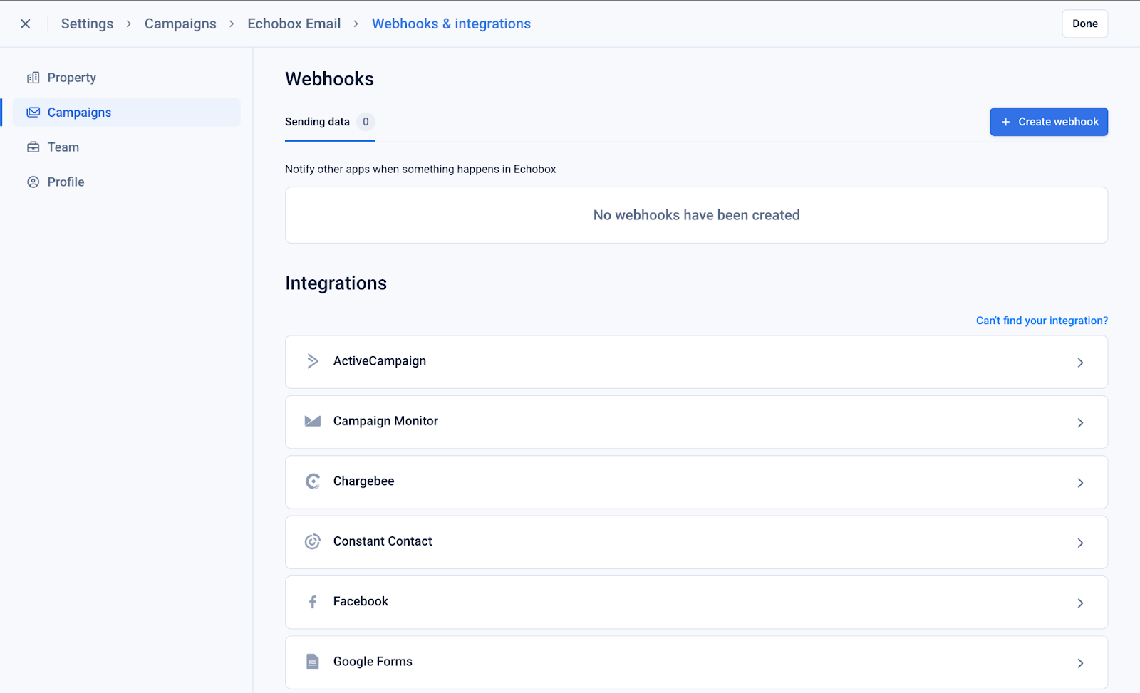 To set up a webhook navigate to the settings for your campaign and click ‘Webhooks & Integrations’.