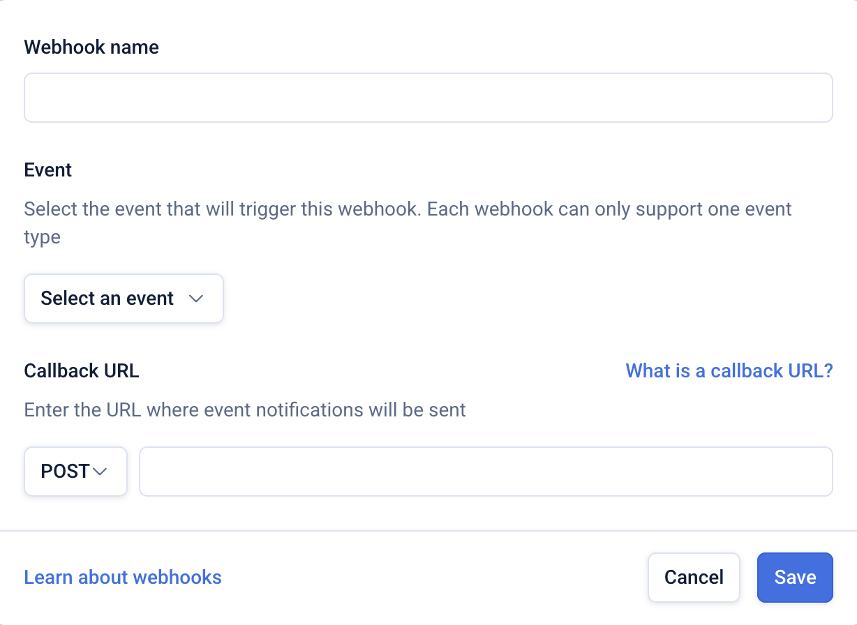 Click ‘Create webhook’ and enter a webhook name which must be unique per campaign.