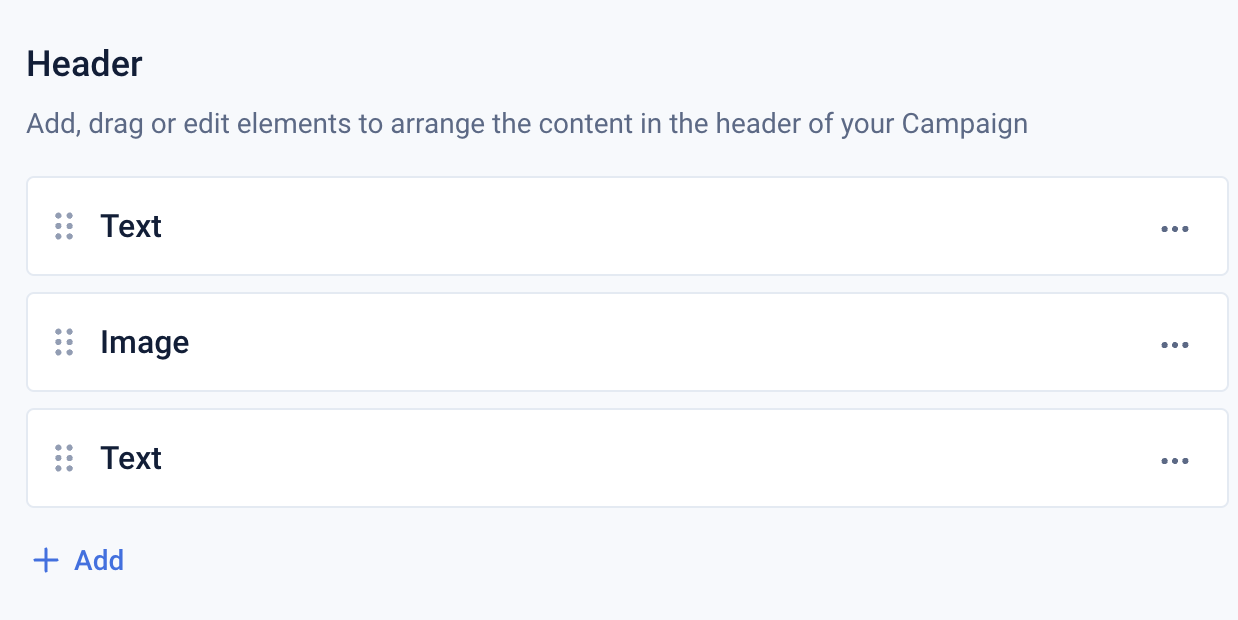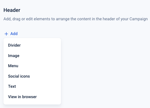 To create or edit your newsletter header navigate to Settings > Campaigns > Campaign Name > Content and click on the ‘Header’ or ‘Footer’ tab.