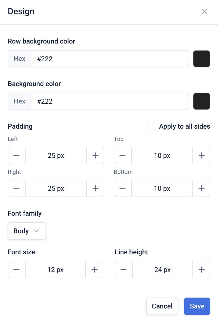 Common settings include the background color for the block and the row, and the padding that should be applied to the block contents.