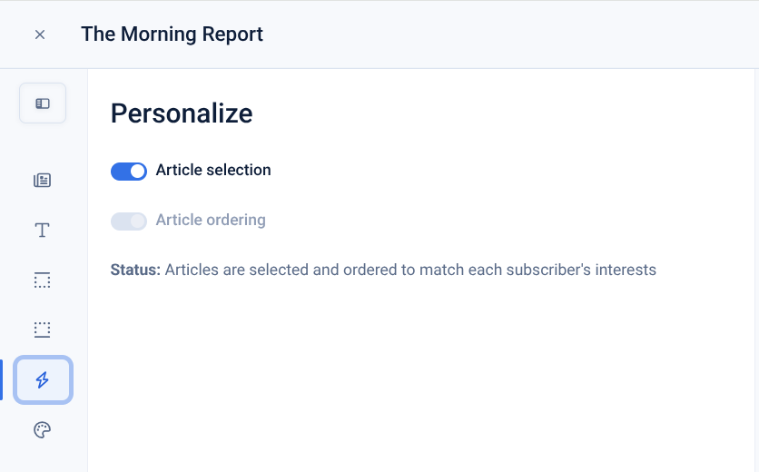 - Content selection: The AI chooses specific articles for each user based on their unique interests. This is ideal for niche retention and high-relevance sends.