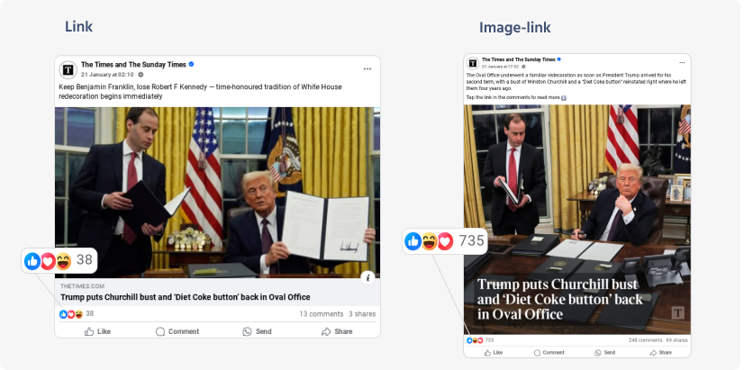 In this real example below, we can see two shares of the same article: on the left a conventional link post, on the right an image post with the article’s URL placed in the first comment.
