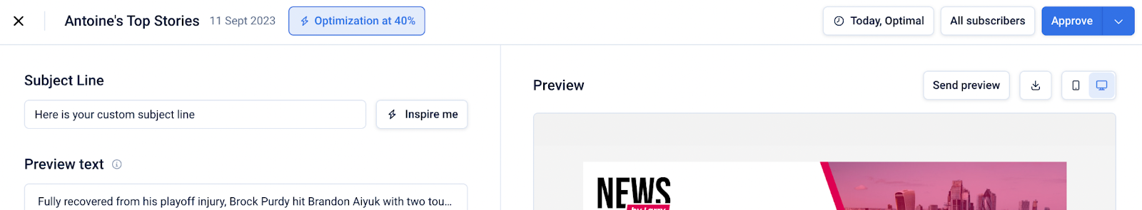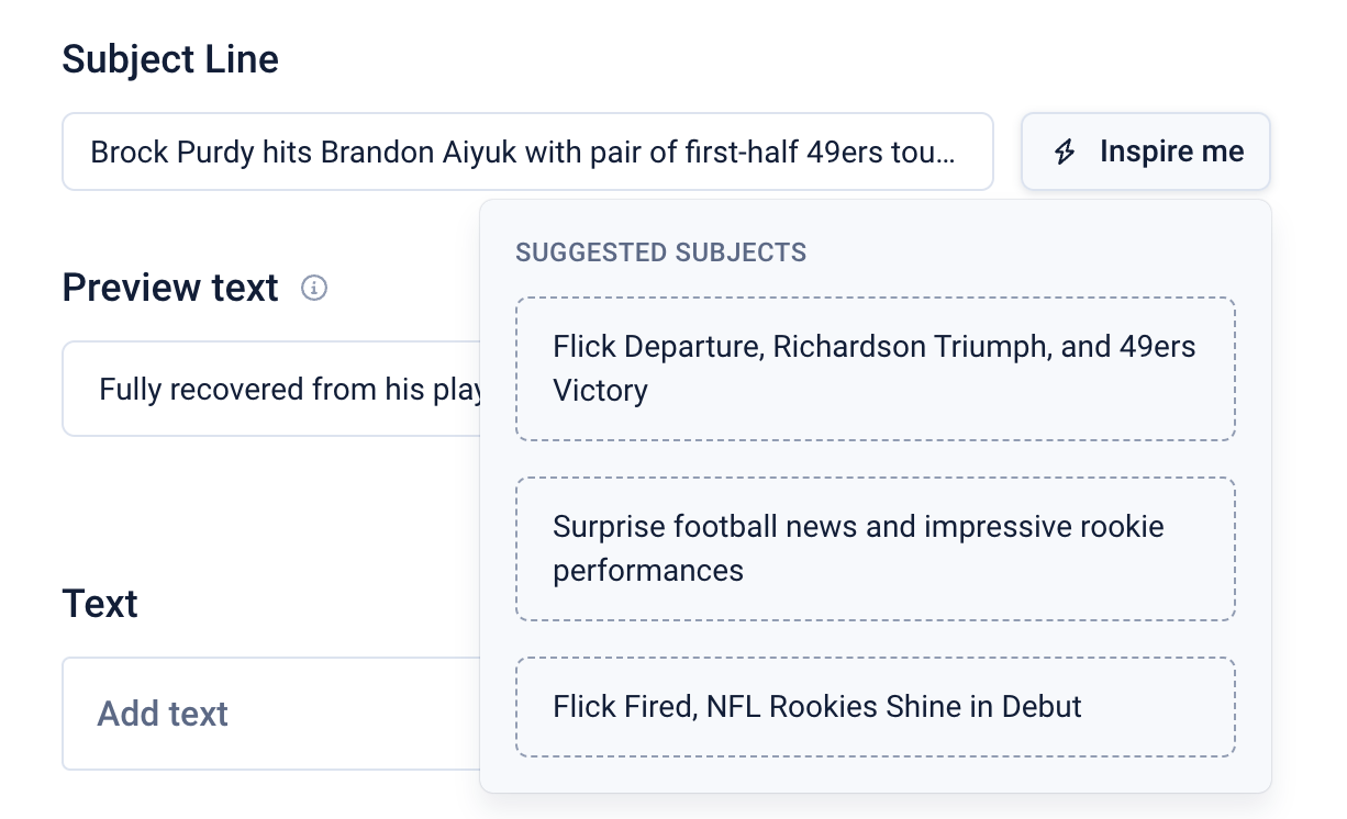 On the Curate Page, you can press Inspire me to have ChatGPT suggest subject lines for your Edition. These are generated based on the top three articles in your Edition, and are designed to follow subject line best practices.