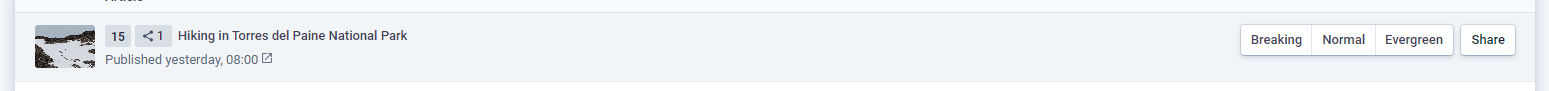 Clicking on one of the timing options (Breaking, Normal or Evergreen) will classify (or reclassify) the article. This not only helps to train Echobox to classify future articles more accurately, but it also ensures that you’ll be able to filter articles more accurately on your next visit to the archive.