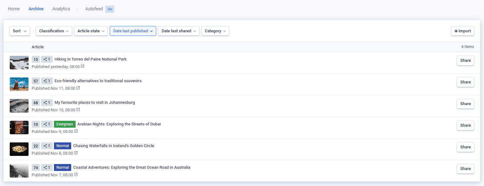 The Archive shows all of the articles published on your content feed(s). It provides you with a convenient way to view all of your historical articles, and reclassify and/or reshare them.