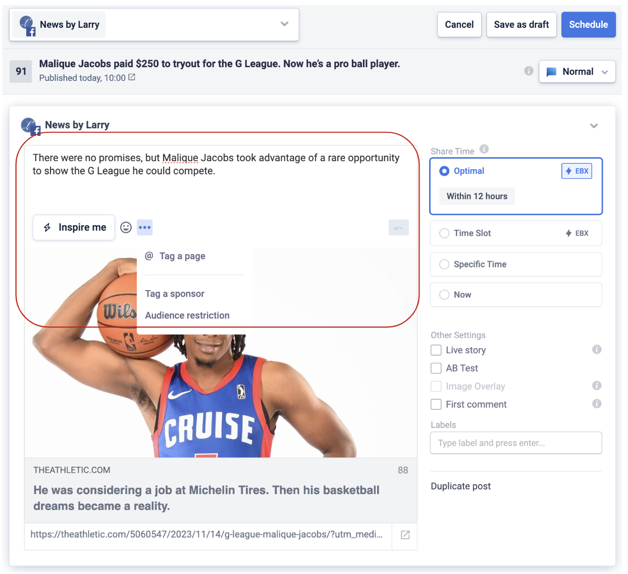 When you open the Compose Box, you will find it pre-populated with a default share message of your choice (you can change this in your Page settings). You can, of course, choose to use your own custom share message or make use of the Inspire me button (Fig. 6), which uses the latest generative AI technology and creates a unique description in your writing style within seconds.  You can also add tags, emoji and hashtags.