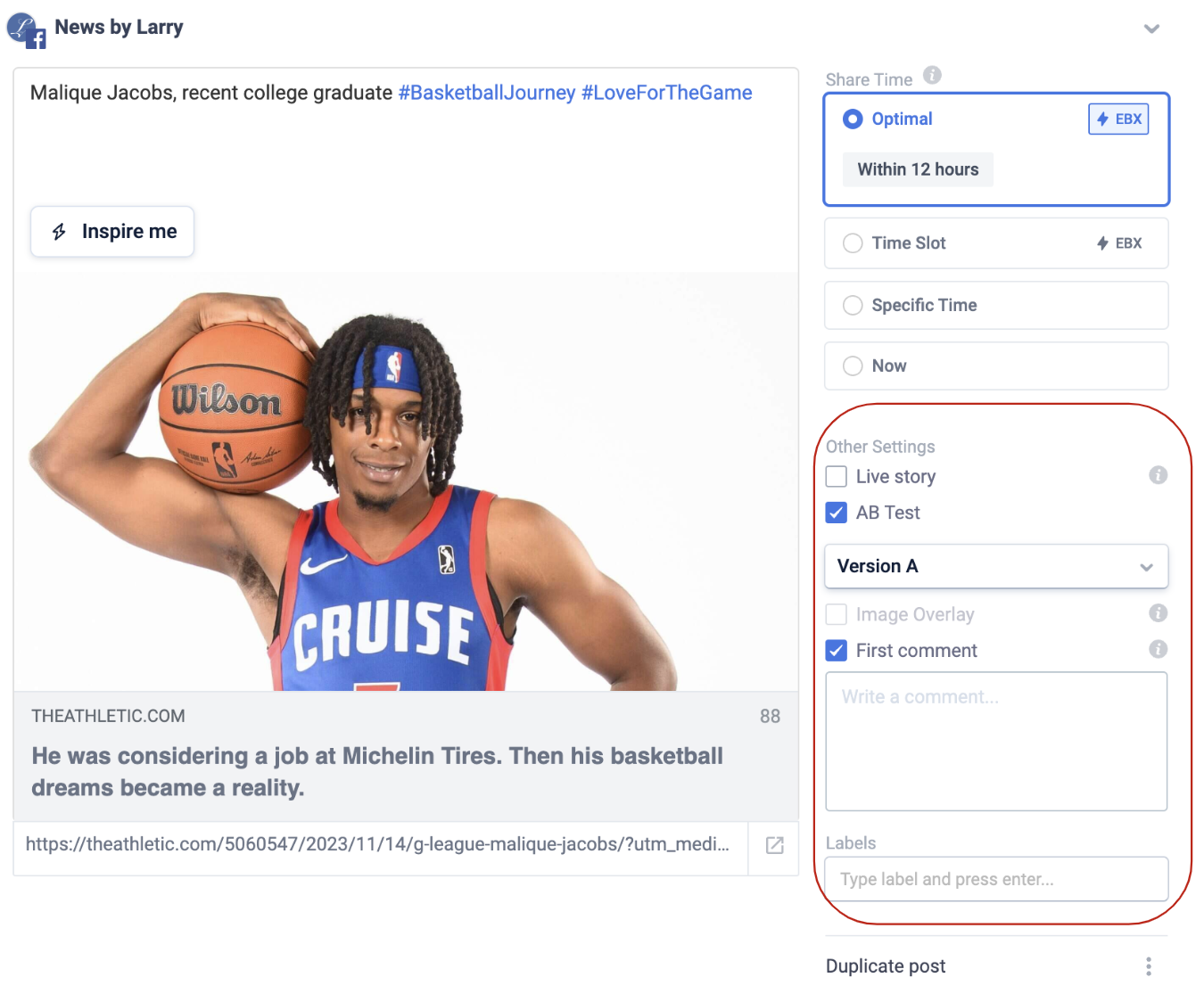 You can AB test a post to learn more about your audience’s preferences. If you choose this, you can switch in a drop-down list between Version A and Version B and edit each version. There are specific parts of a share you can vary as part of an AB test, namely the share message, article title, article description, share image, share video (in case of a video post), and the image overlay. Echobox will then show each version of the post to a selected group of users, and after a short time proceed to show the winning version to your entire audience. You can find the results of all your AB tests in your Analytics tab. For more information about AB testing best practices see this article .