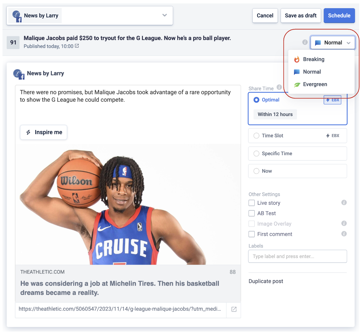 On the right-hand side, you’ll see the Time Sensitivity classification (Fig. 5). This falls into one of three categories - Normal, Breaking, or Evergreen. This is another one of Echobox Social’s smart features and gets automatically populated for you. However, you can always change the classification if you wish.