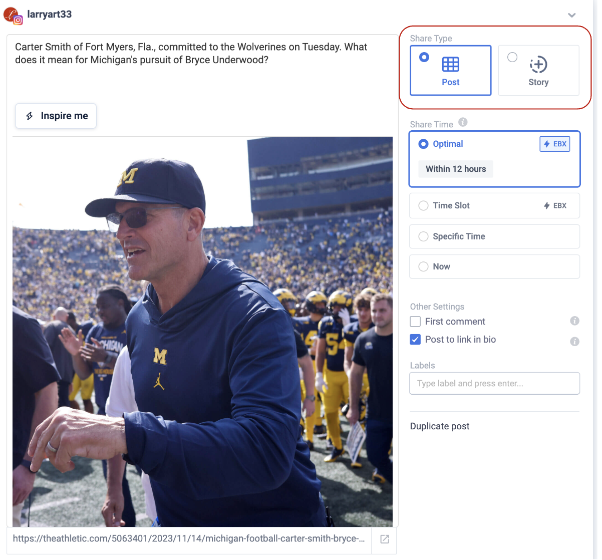 When opening the Compose Box for an article from your Home feed, you will see the option to share the share image to Instagram as a Feed Post or a Story.