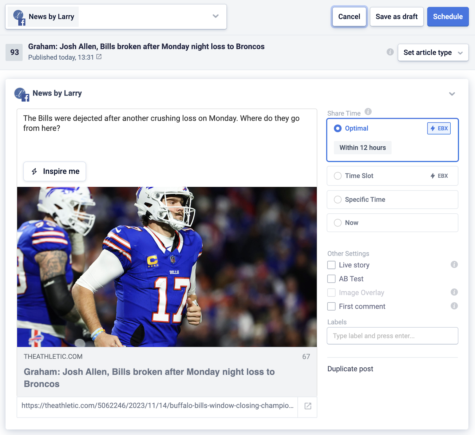 If you choose Optimal, your share will go out at the best moment within a timeframe we calculate based on the Time Sensitivity of the content. If you choose the Time Slot option, Echobox will choose the best moment within the time frame you choose.